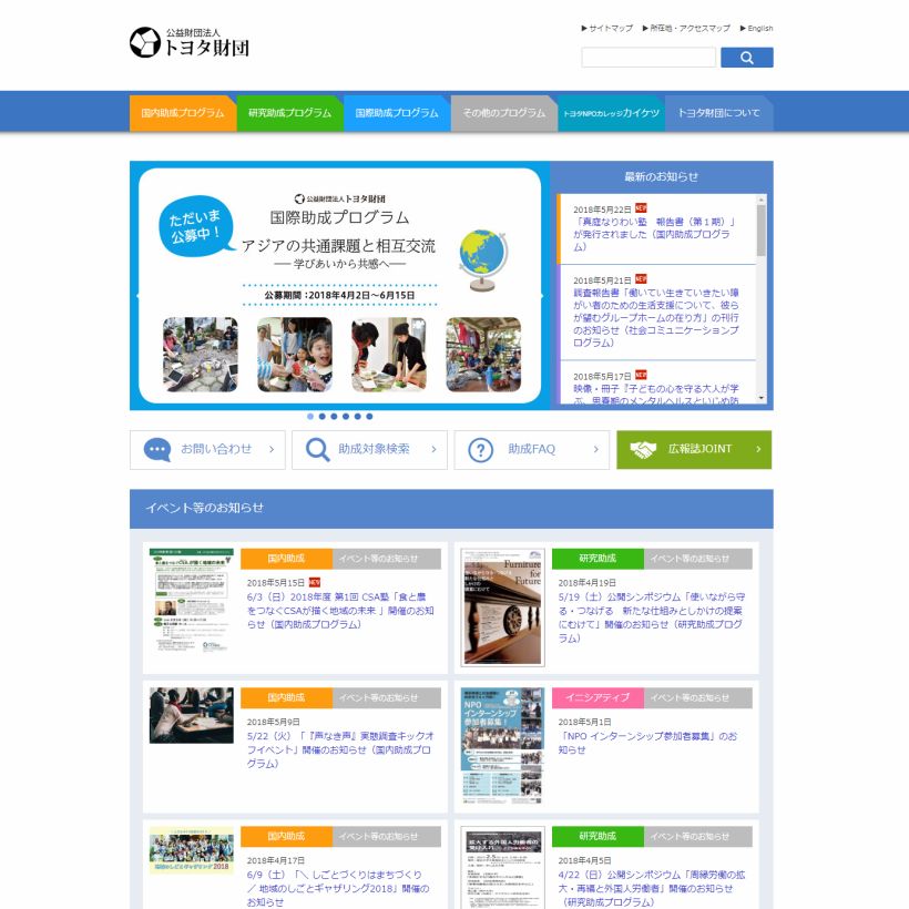 公益財団法人トヨタ財団様は「生活・自然環境」「社会福祉」「教育文化」の3領域を中心に、世界規模で課題をとりあげ、その研究ならびに事業に対して助成を行う財団です。2012年は東北大震災を受けて震災関連の助成も実施されました。1974年、トヨタ自動車によって設立されました。